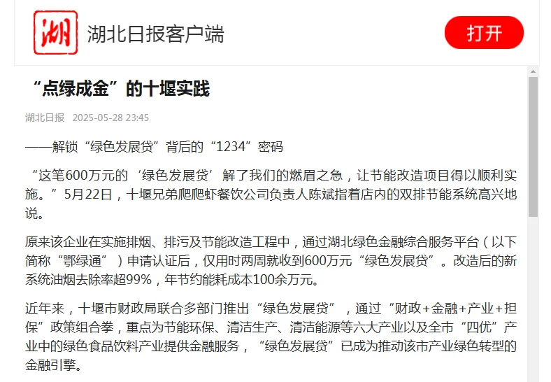 “這筆600萬元的‘綠色發(fā)展貸’解了我們的燃眉之急,讓節(jié)能改造項(xiàng)目得以順利實(shí)施?!?月22日,十堰兄弟爬爬蝦餐飲公司負(fù)責(zé)人陳斌指著店內(nèi)的雙排節(jié)能系統(tǒng)高興地說。