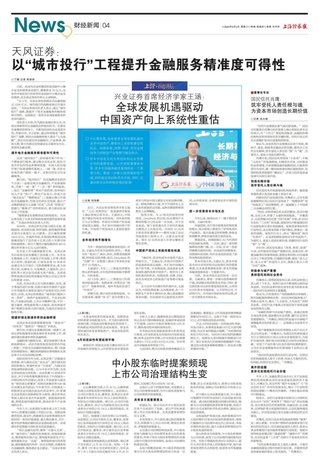 該負(fù)責(zé)人介紹,作為湖北省屬唯一證券公司,天風(fēng)證券始終牢記金融國(guó)企的使命擔(dān)當(dāng),在湖北宏泰集團(tuán)的領(lǐng)導(dǎo)下,不斷加快國(guó)有企業(yè)改革步伐,苦練內(nèi)功、守正創(chuàng)新,通過(guò)持續(xù)推進(jìn)“城市投行”戰(zhàn)略,將綜合金融服務(wù)嵌入湖北“七大戰(zhàn)略”,堅(jiān)決當(dāng)好湖北的金融顧問(wèn)、產(chǎn)業(yè)參謀、招商大使,努力為湖北加快建成支點(diǎn)提供全方位、系統(tǒng)性金融支撐